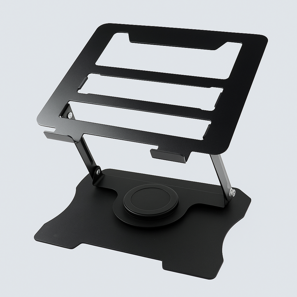 Crni rotirajući stalak za laptop dizajniran je za sve koji žele stabilnu i profesionalnu podlogu za svoj uređaj. Napravljen je od visokokvalitetnog ugljeničnog čelika koji obezbeđuje čvrstoću, dugotrajnost i elegantan izgled na svakom stolu.