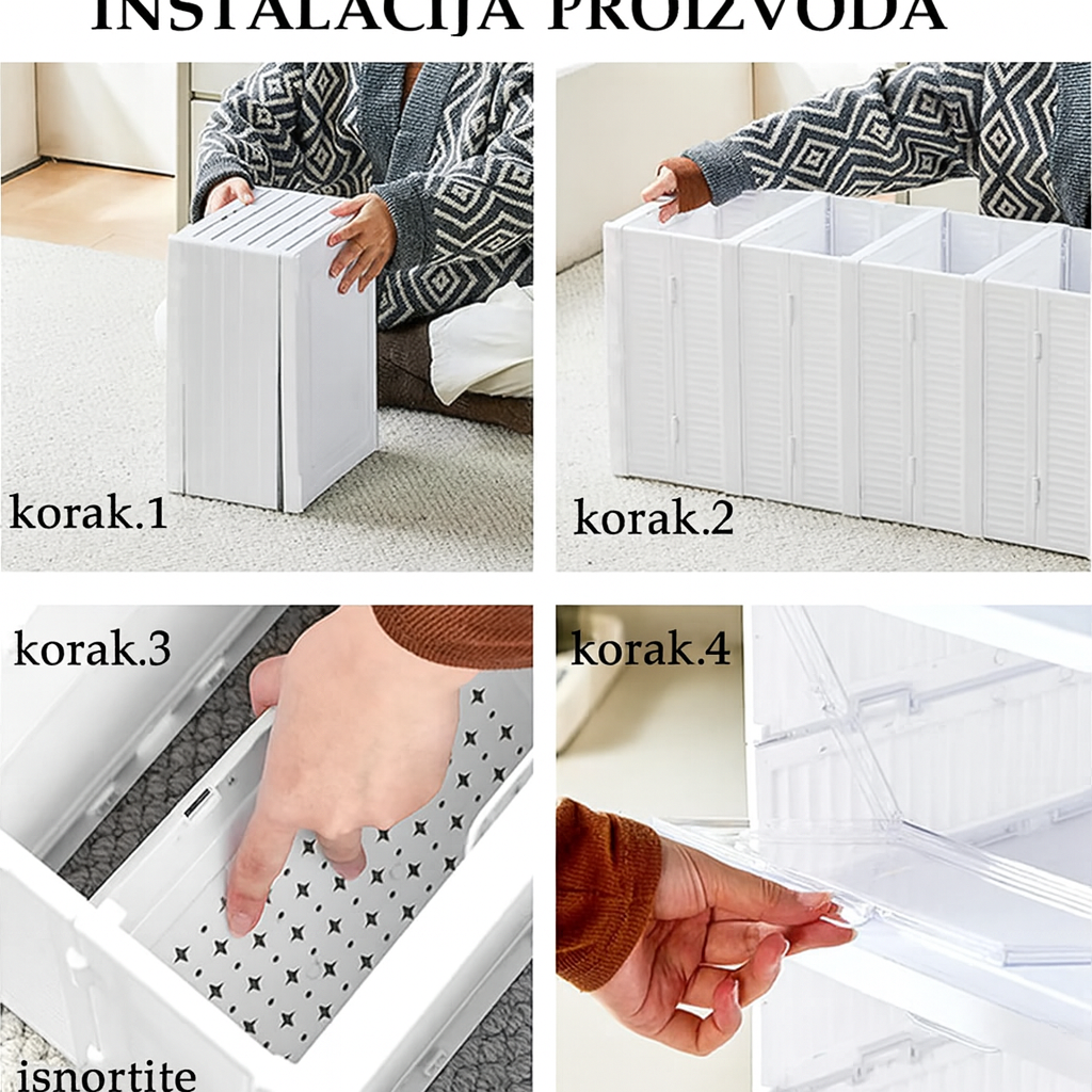 Svaka kutija ima vrata na preklop koja se otvaraju bez napora. Više nema potrebe da vadite sve cipele iz gomile da biste došli do para koji želite. Samo otvorite željenu kutiju i uzmite obuću.