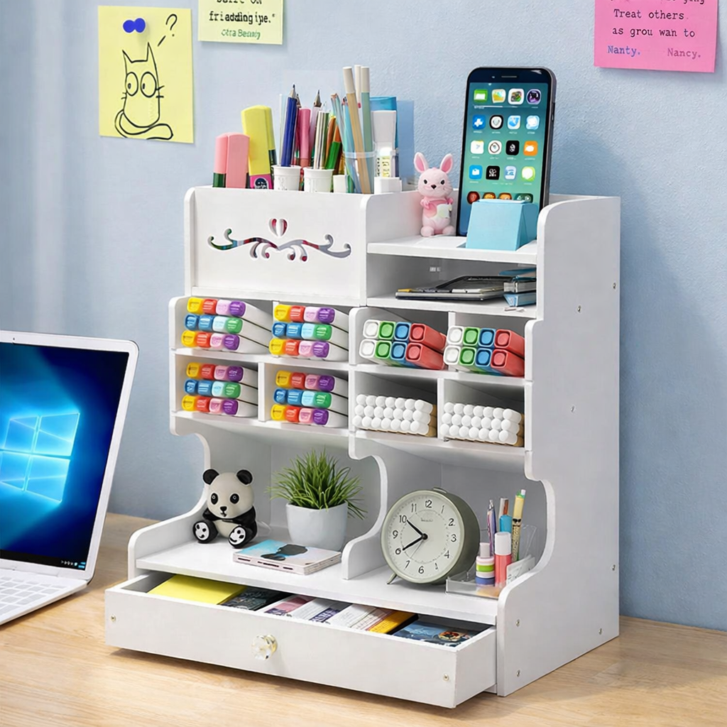 Učinite svoj radni prostor urednim, preglednim i inspirativnim uz ovu praktičnu stolnu policu sa više pregrada i fiokom.