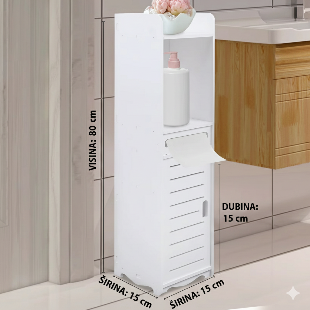 Pametan dizajn – gornje police za bočice i kozmetiku, srednji deo sa kliznim poklopcem za papir, donji deo za dodatne potrepštine.