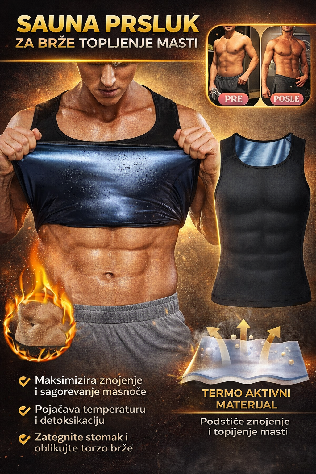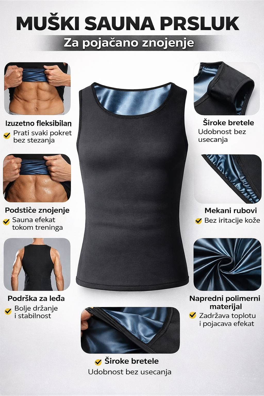 Transformišite svoj trening uz muški sauna prsluk dizajniran da maksimizira znojenje i pojača efekat svakog pokreta. Idealan dodatak treningu koji pomaže da brže vidite rezultate i oblikujete gornji deo tela.