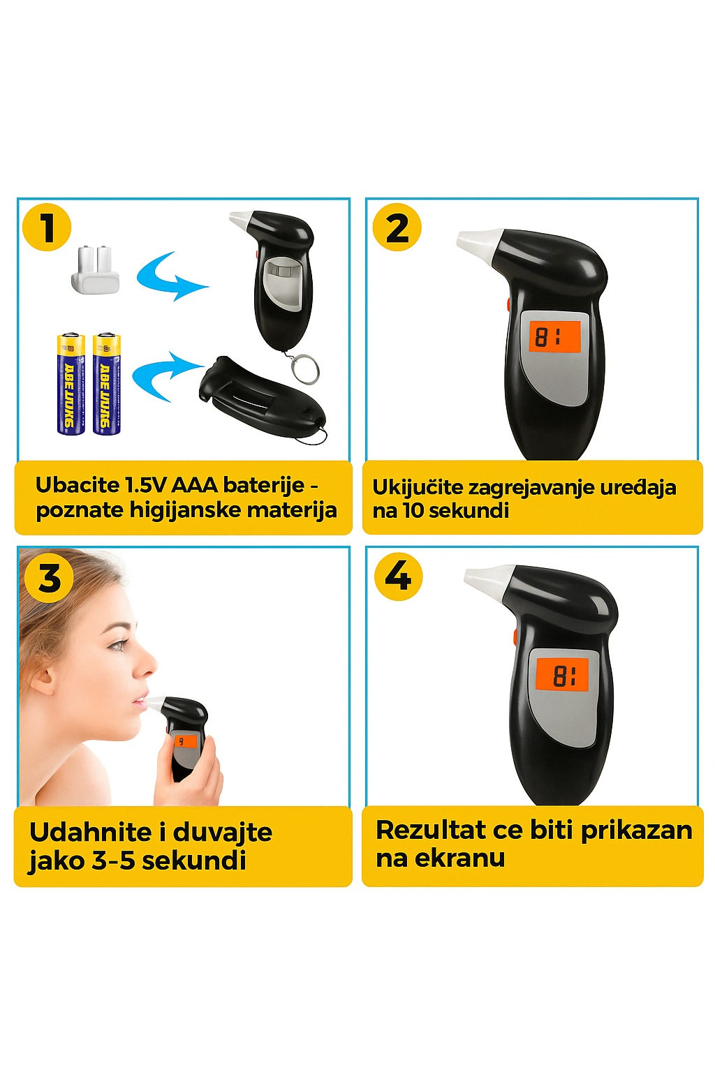 Ovaj digitalni alko tester meri procenat alkohola u izdahnutom vazduhu i prikazuje rezultat na LCD ekranu u svega nekoliko sekundi.