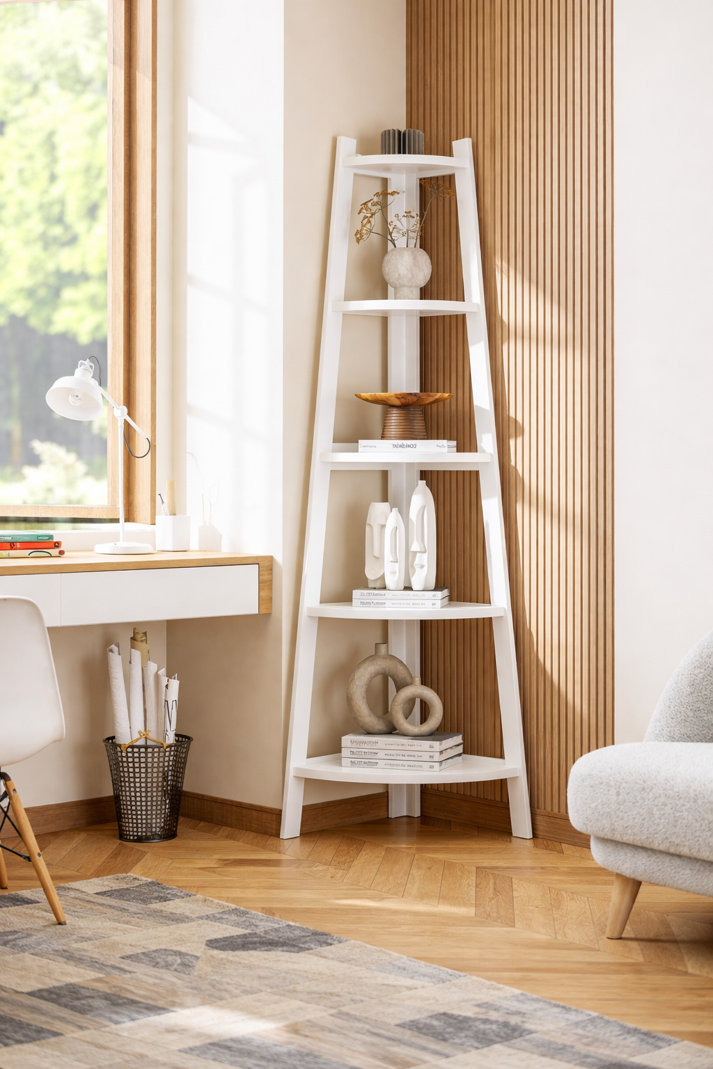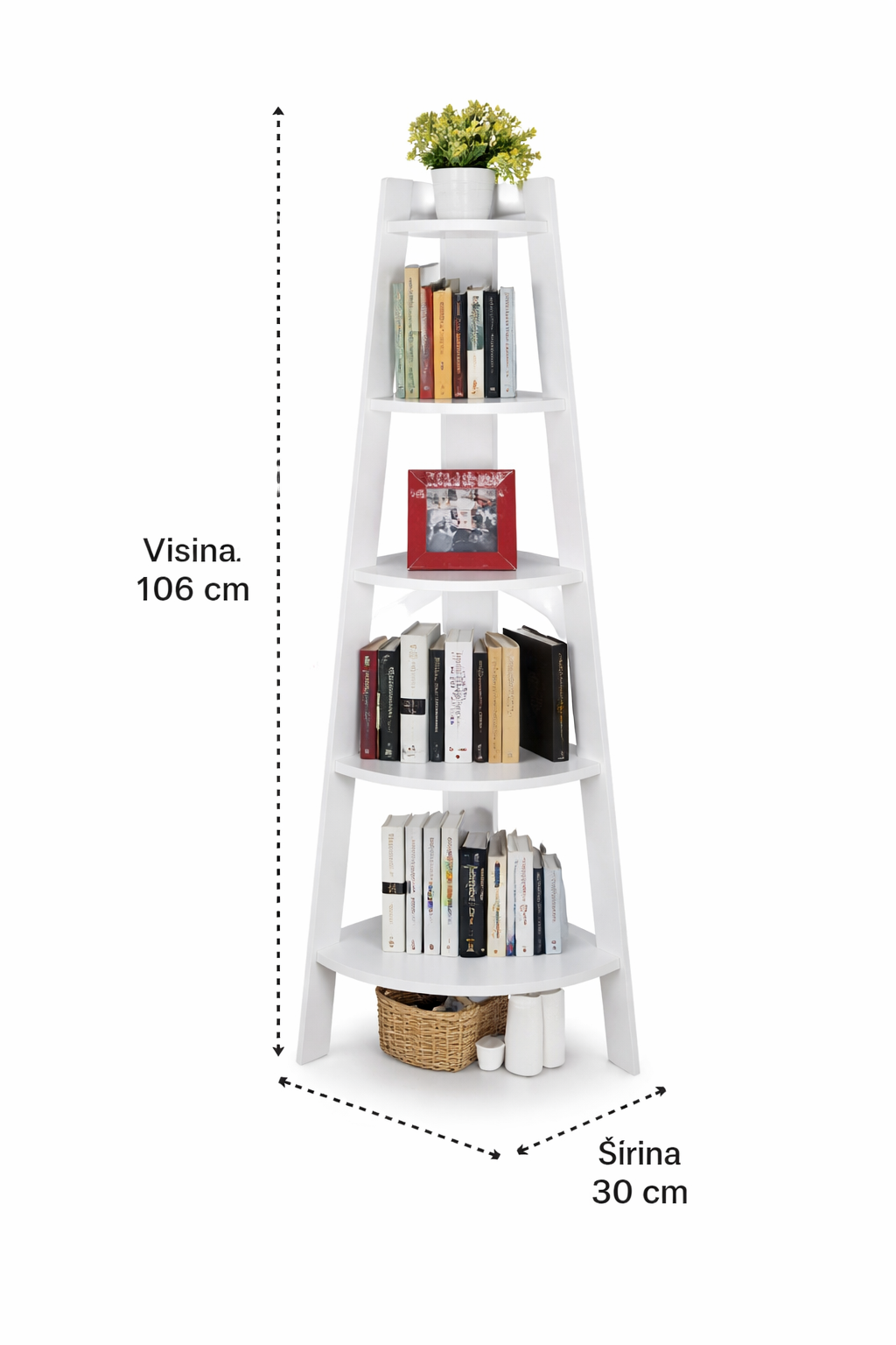 Bela ugaona polica sa 5 nivoa dizajnirana je da maksimalno iskoristi prostor koji inače ostaje prazan. Savršeno se uklapa u ćošak dnevne sobe, kancelarije, spavaće ili dečije sobe.